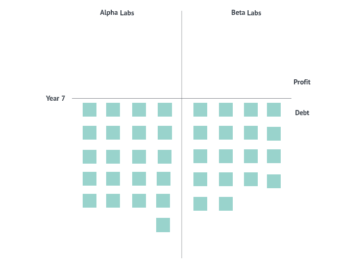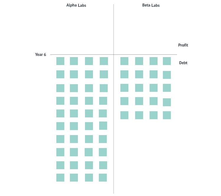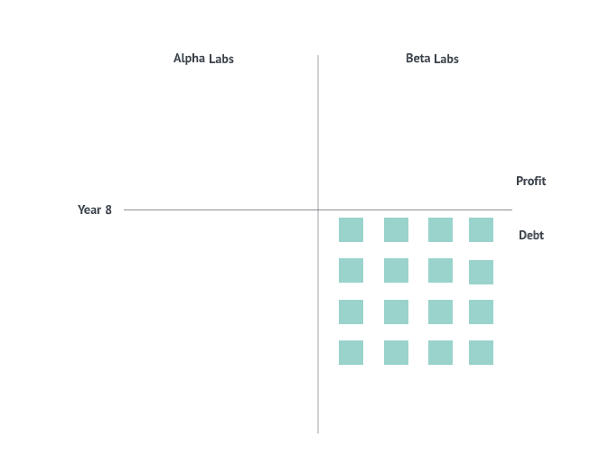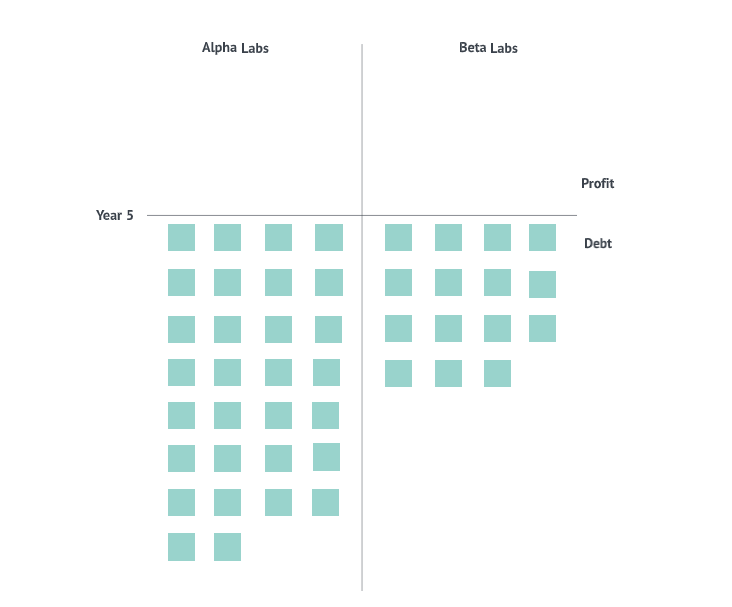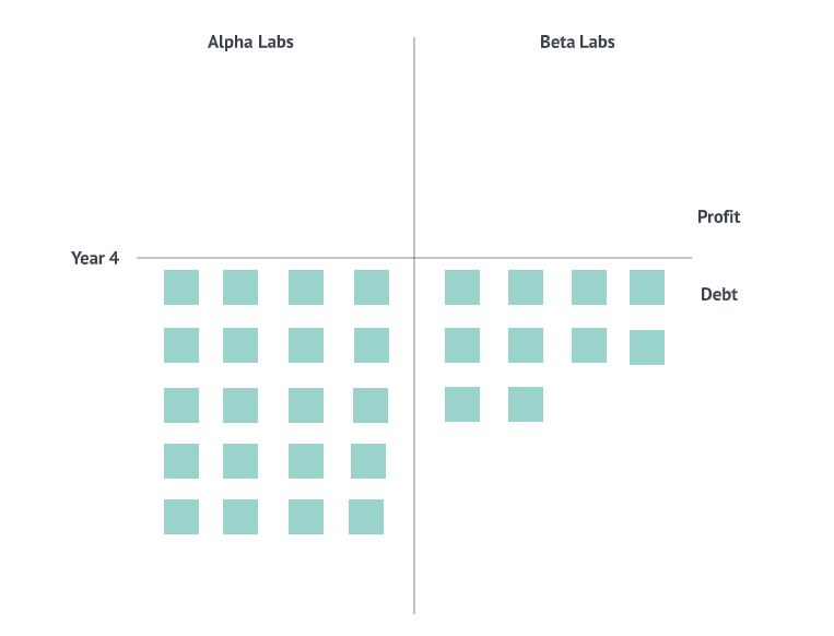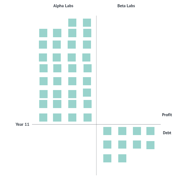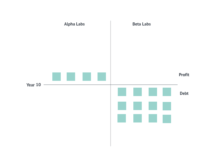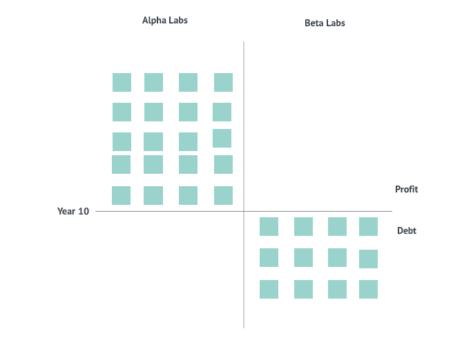 Now, we’ll use blocks of capital to represent the economics of both Alpha Labs and Beta Labs over the next many years so as to compare what their debt & profit would look like.