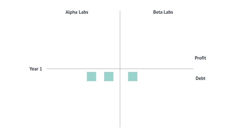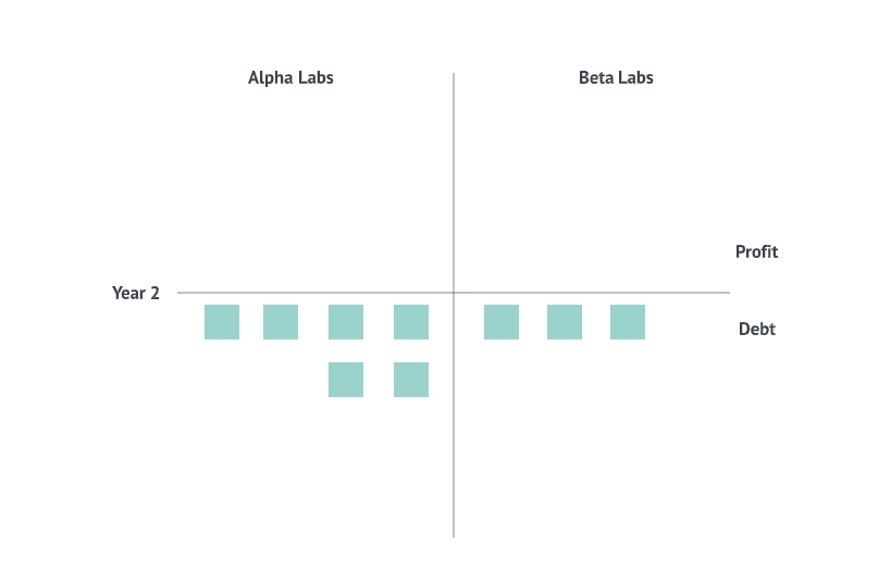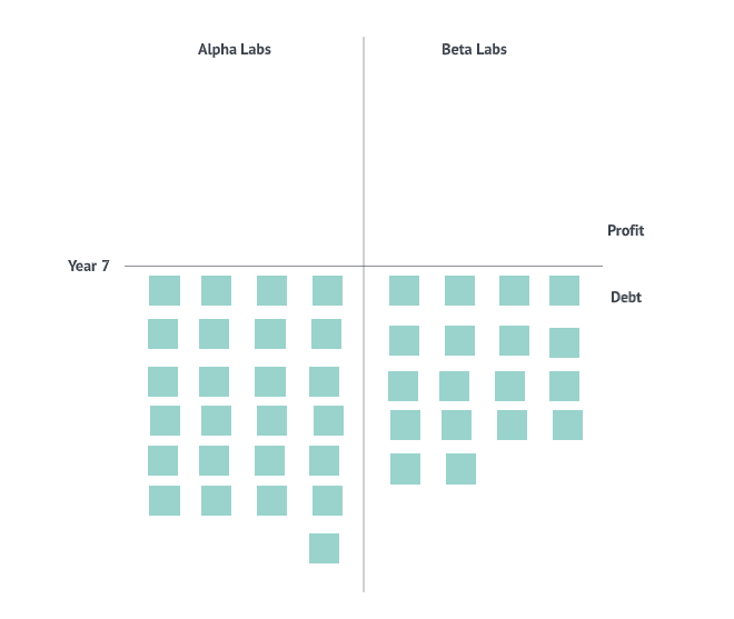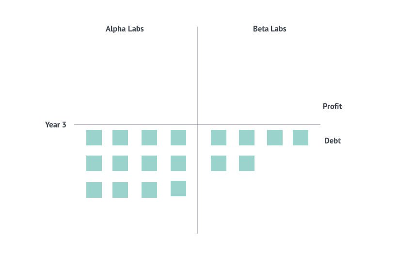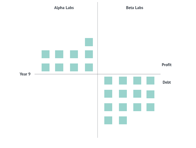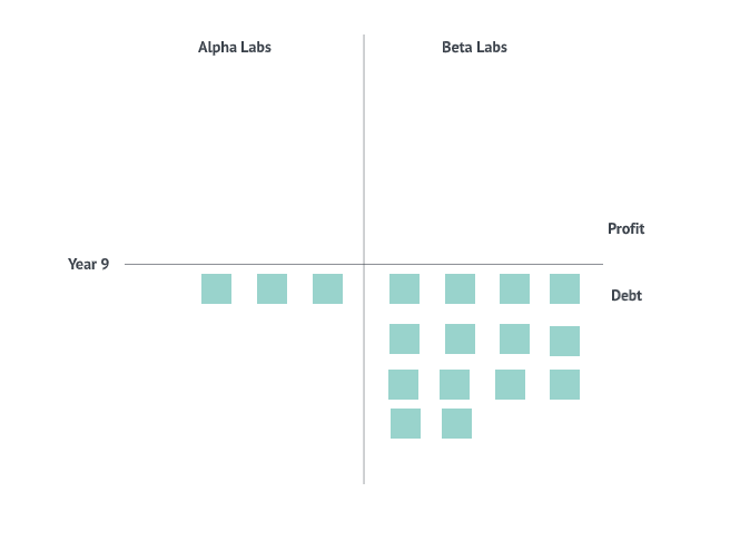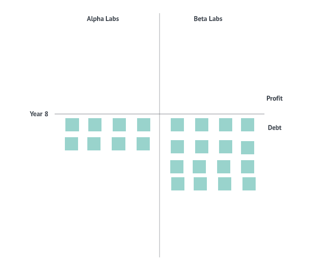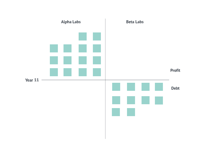 Now, we’ll use blocks of capital to represent the economics of both Alpha Labs and Beta Labs over the next many years so as to compare what their debt & profit would look like.