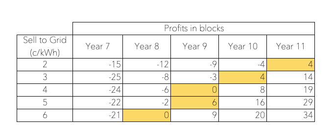 As you can see from the table above, in all cases upto 2c/kWh, Alpha Labs would turn a profit by year 11 (all highlighted in yellow).