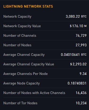 Next, we’ll look at some Lightning Network (LN) market stats. LN is a second layer protocol on top of bitcoin, which scales the base settlement layer by facilitating payments & transactions. We’ve made detailed threads on LN before and continue to provide a weekly update on the subject separate to this newsletter. Find below links to full articles and references on LN-