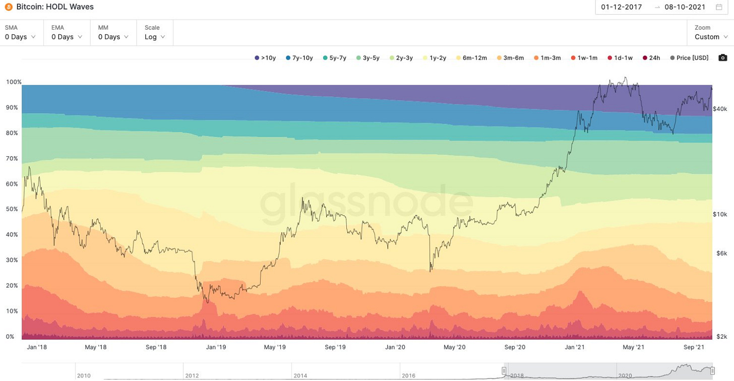 Now, let's look at the current market cycle HODL wave and see if we can pick up on a few things. I'm looking from Dec 2017 to today. As of Oct-2021 UTXO % that has not moved for-